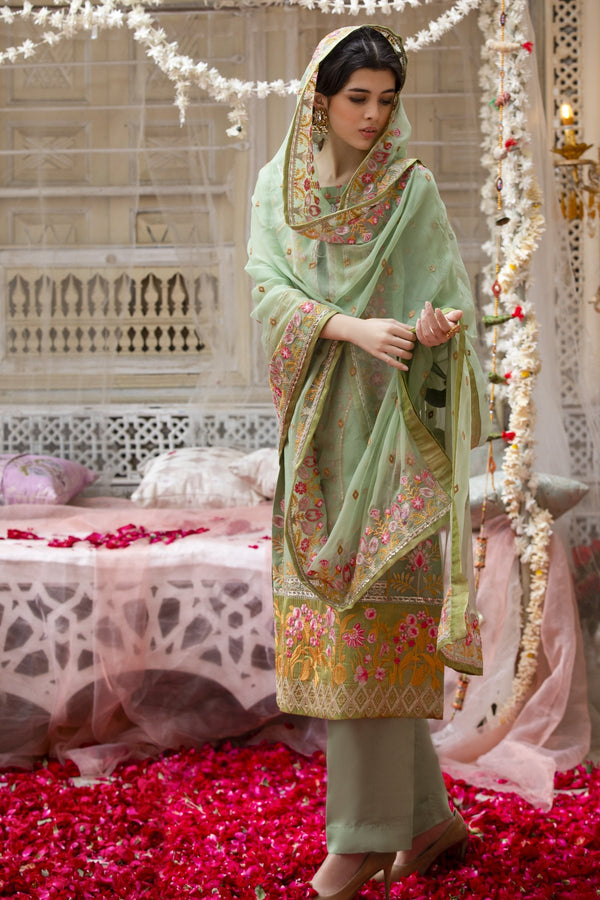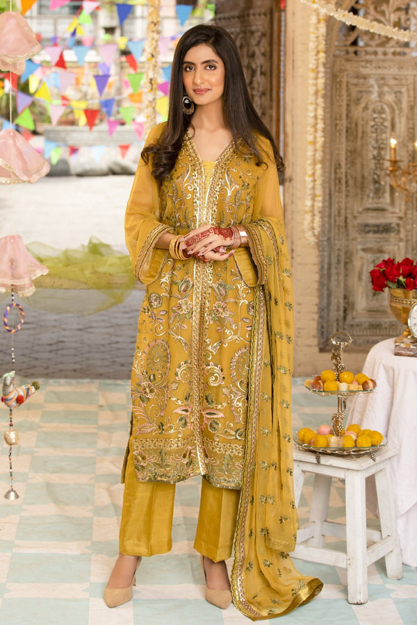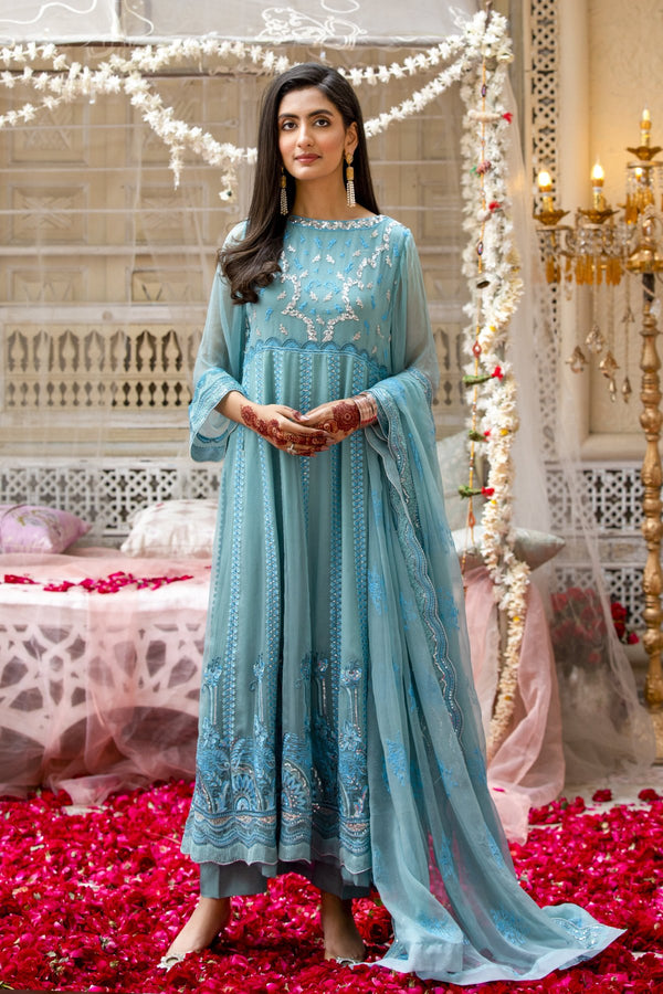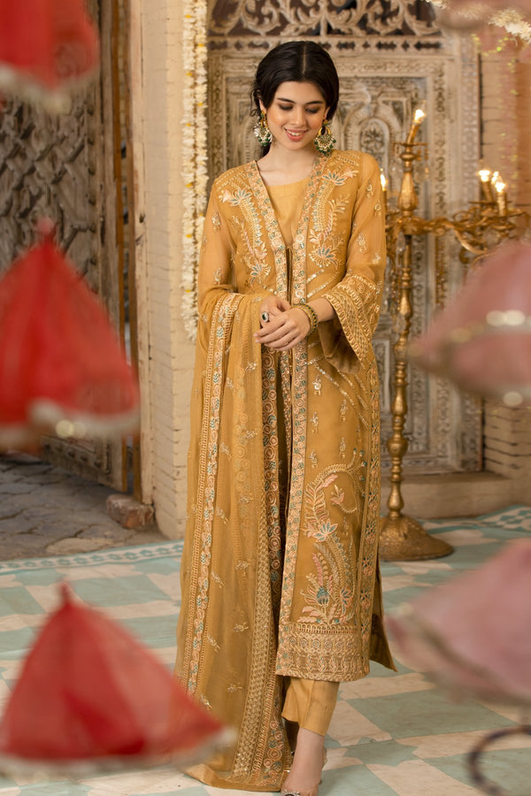 This women's dress includes an embroidered frock with kaliya and embroidered sleeves patches, paired with straight trousers, and an embroidered embellished dupatta. It's perfect for formal events, showcasing exquisite embroidery...