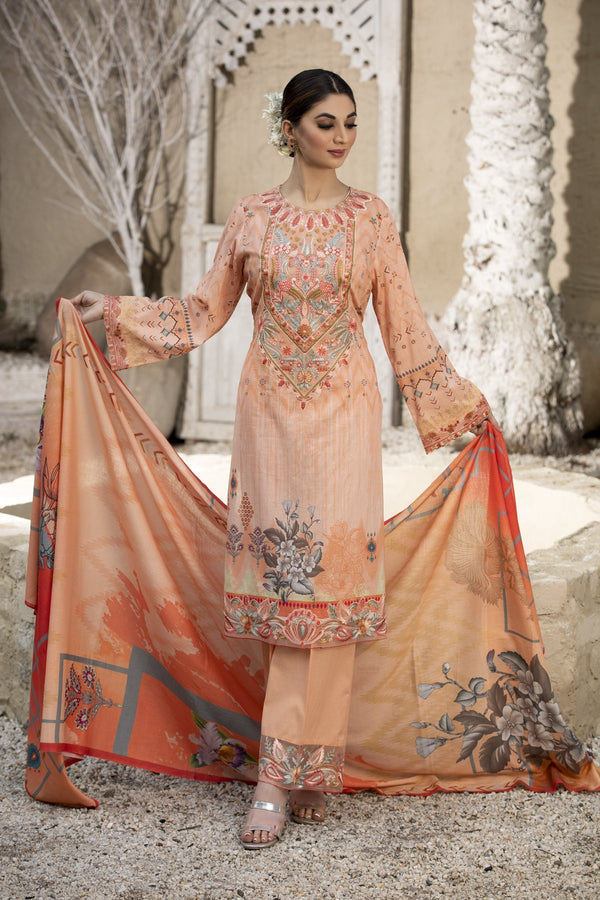 3 Pc Stitched Suite Digital Print shirt with embroidered shirt Embroidery Chiffon dupatta Dyed Cotton Trouser