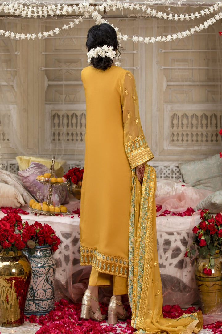 This women's dress is a stunning beauty, featuring an embroidered open gown with intricate designs and detailing on the back, paired with embroidered sleeves patches and straight trousers for a modern and sophisticated look. The dress is completed with a plain viscous inner for added comfort and an embroidered embellished dupatta, showcasing the exceptional embroidery and adding a touch of elegance to the outfit. Perfect for special occasions or formal events.