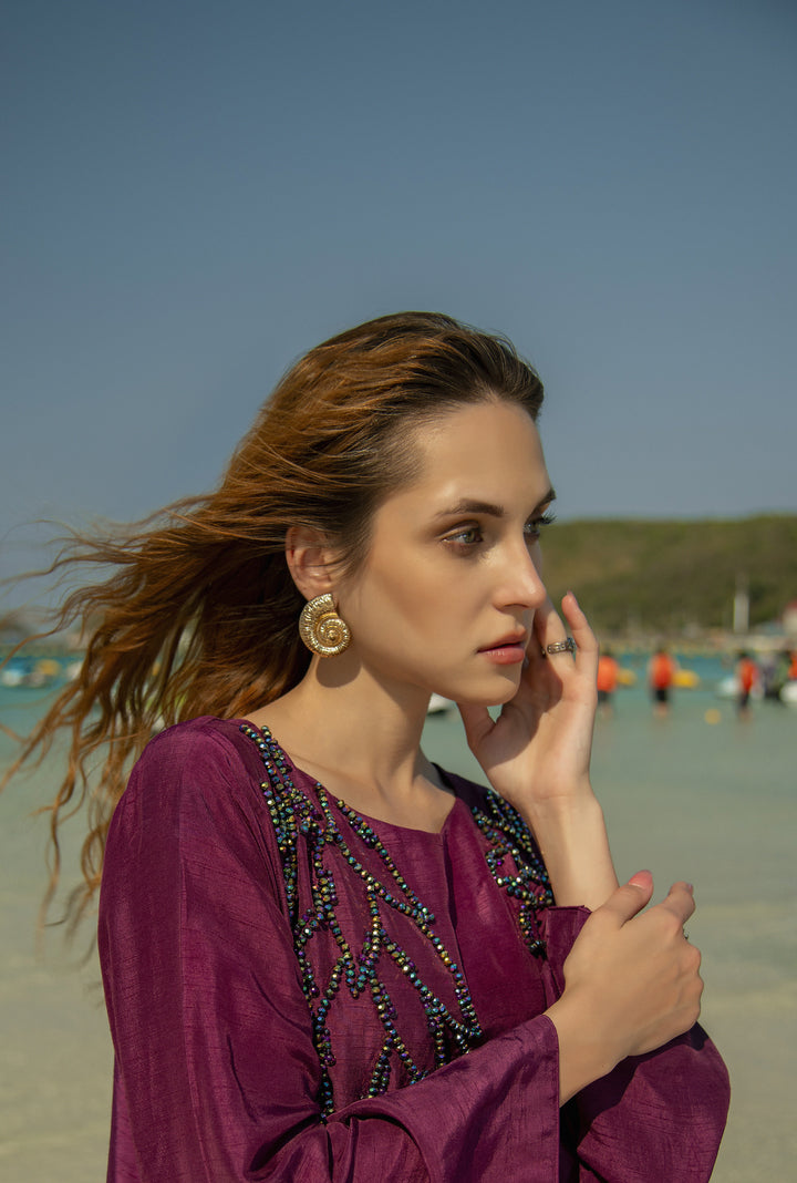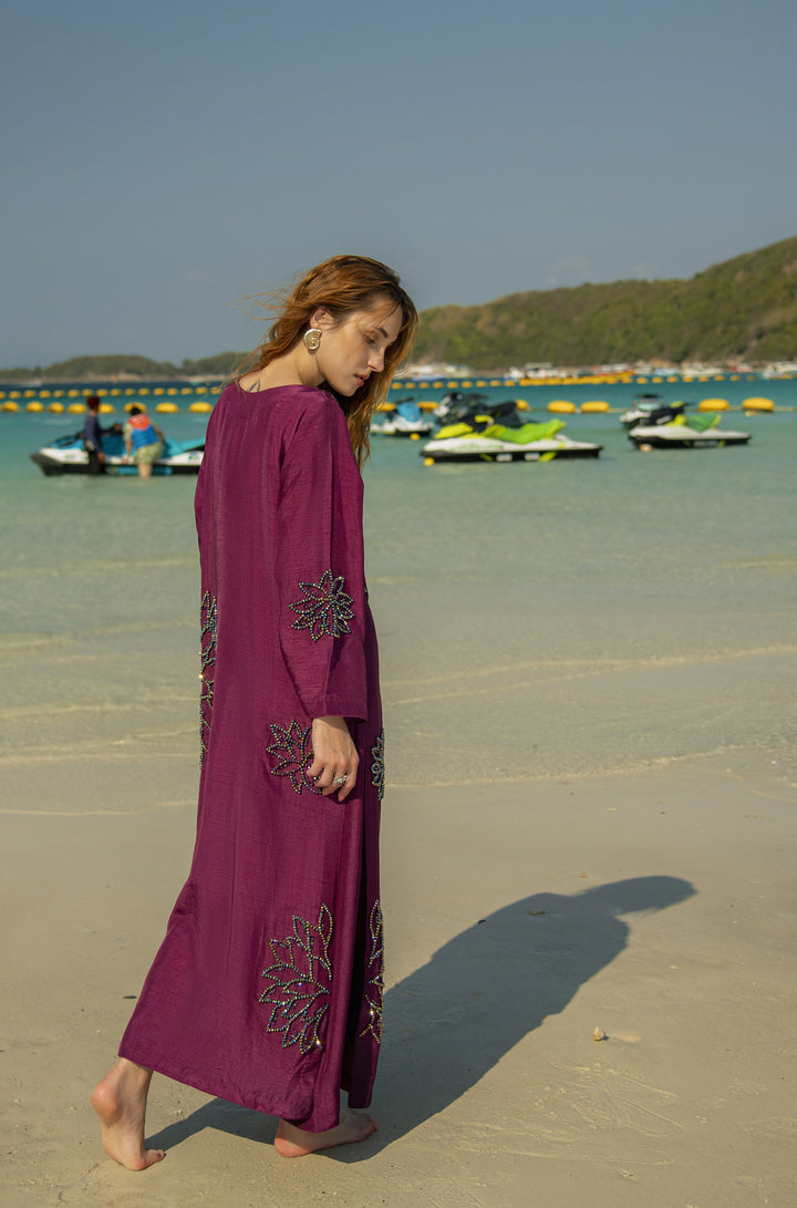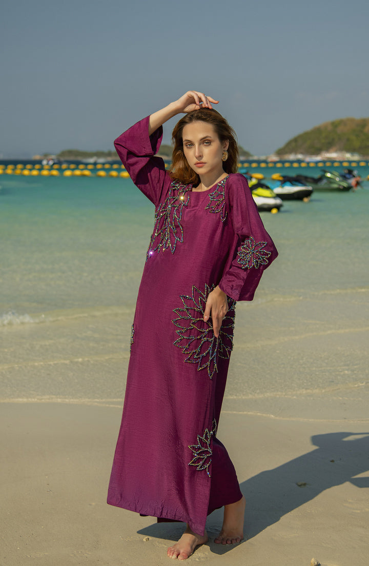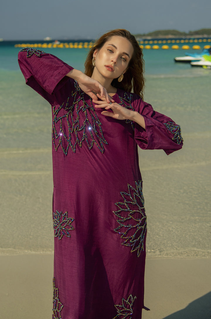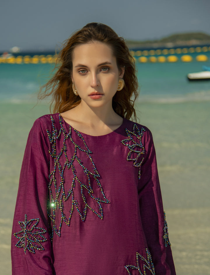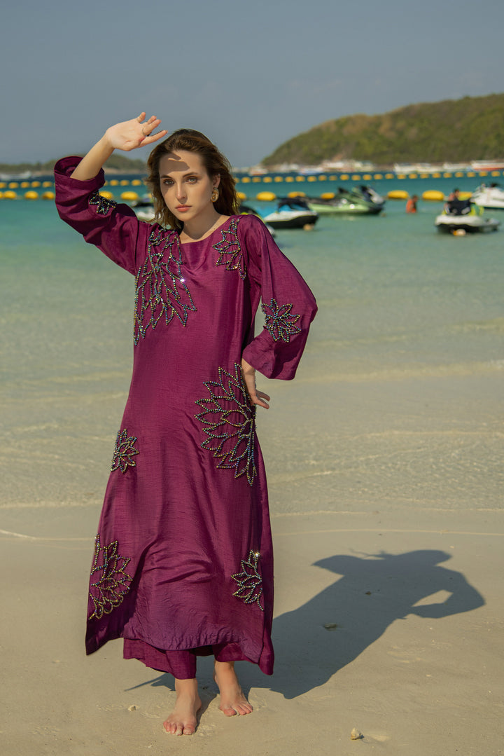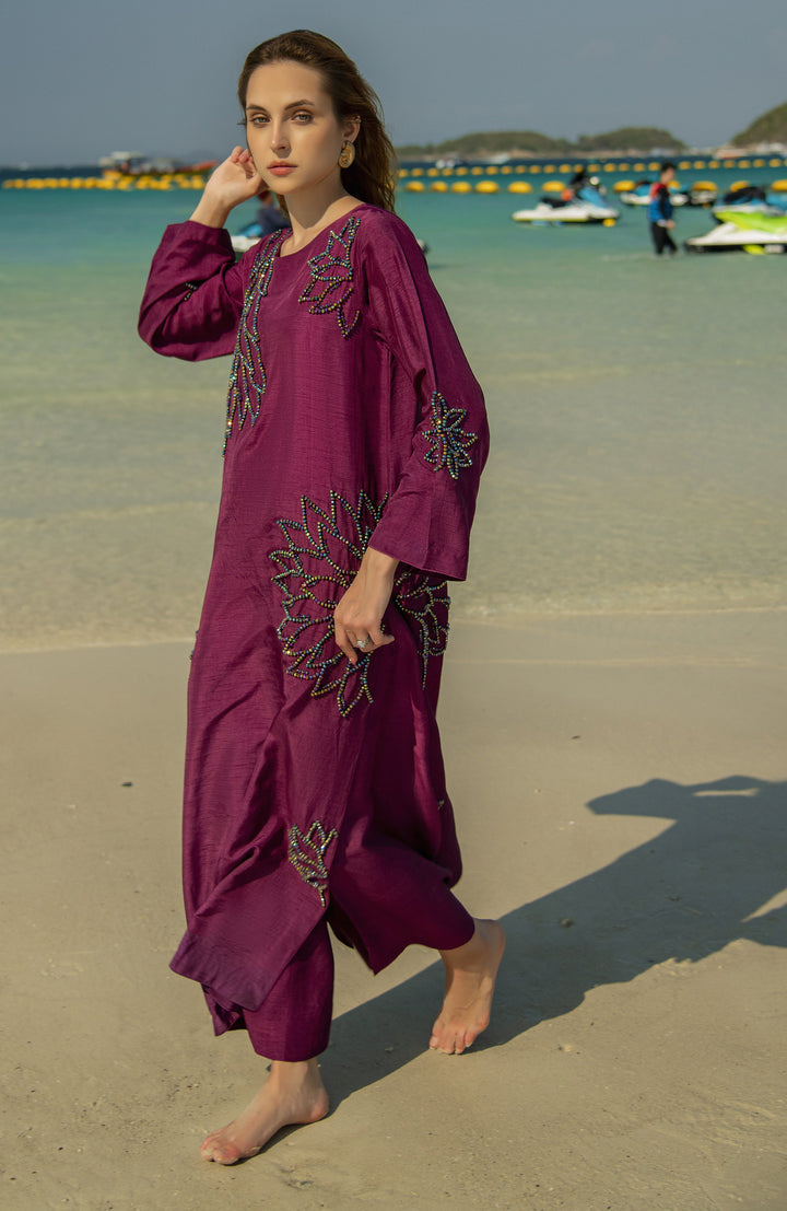 Elevate your wardrobe with this exquisitely designed long dress, crafted from premium custom Khaddi Silk for a breezy and comfortable feel. Featuring a fusion cutline, this ensemble blends traditional elegance with a contemporary silhouette, making it a perfect choice for both festive and casual occasions.