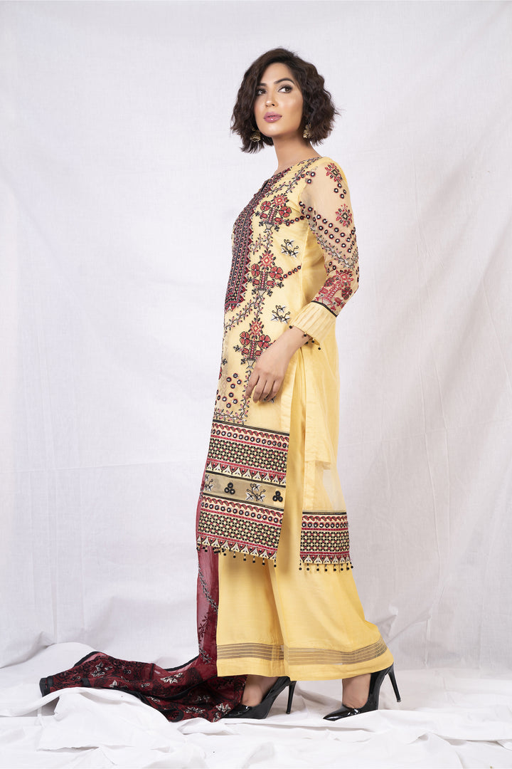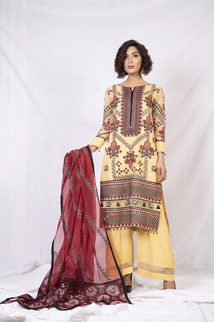 The 3 Piece Embroidered Organza Suit is a stunning outfit perfect for formal events. The set includes a beautifully embroidered shirt, trousers, and a dupatta, all made from lightweight and airy organza fabric. The intricate design and delicate fabric make this suit a show-stopping piece, sure to turn heads wherever you go. Perfect for weddings, galas, or other special occasions, this suit is a must-have for anyone looking to make a lasting impression.