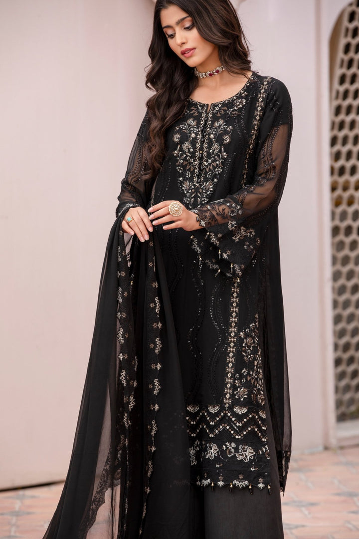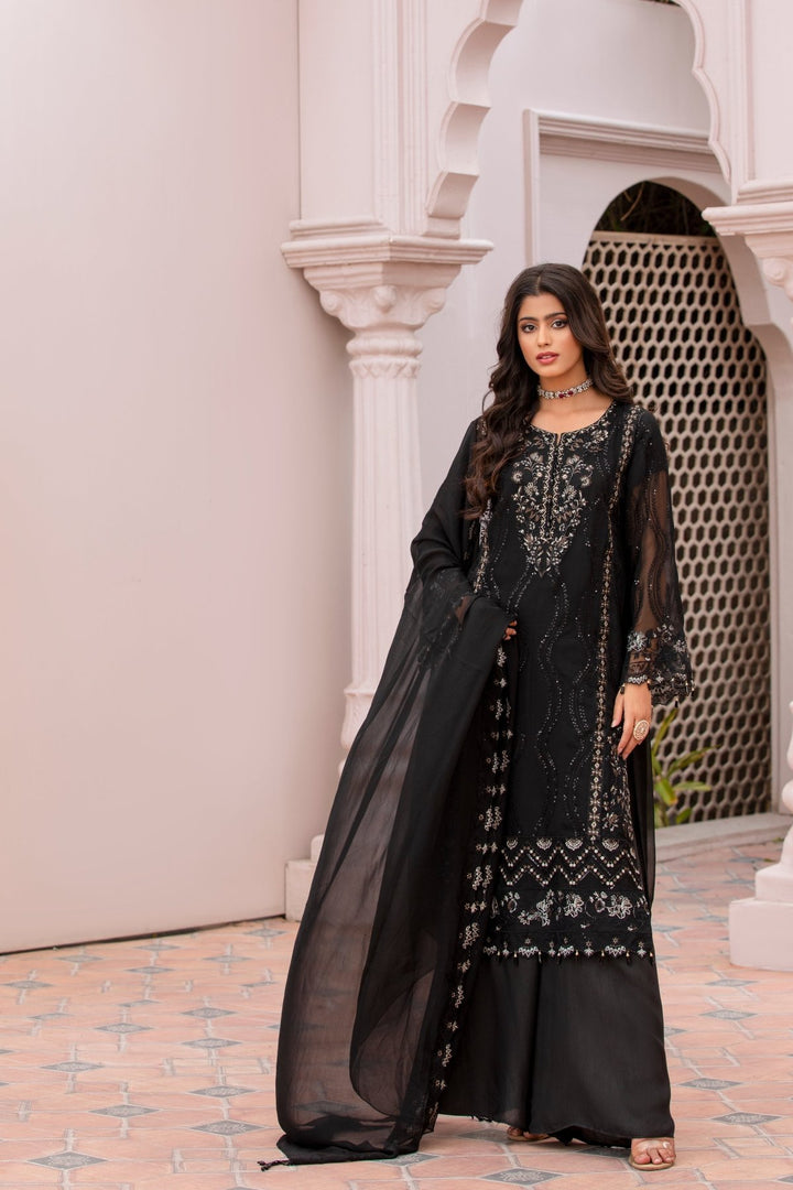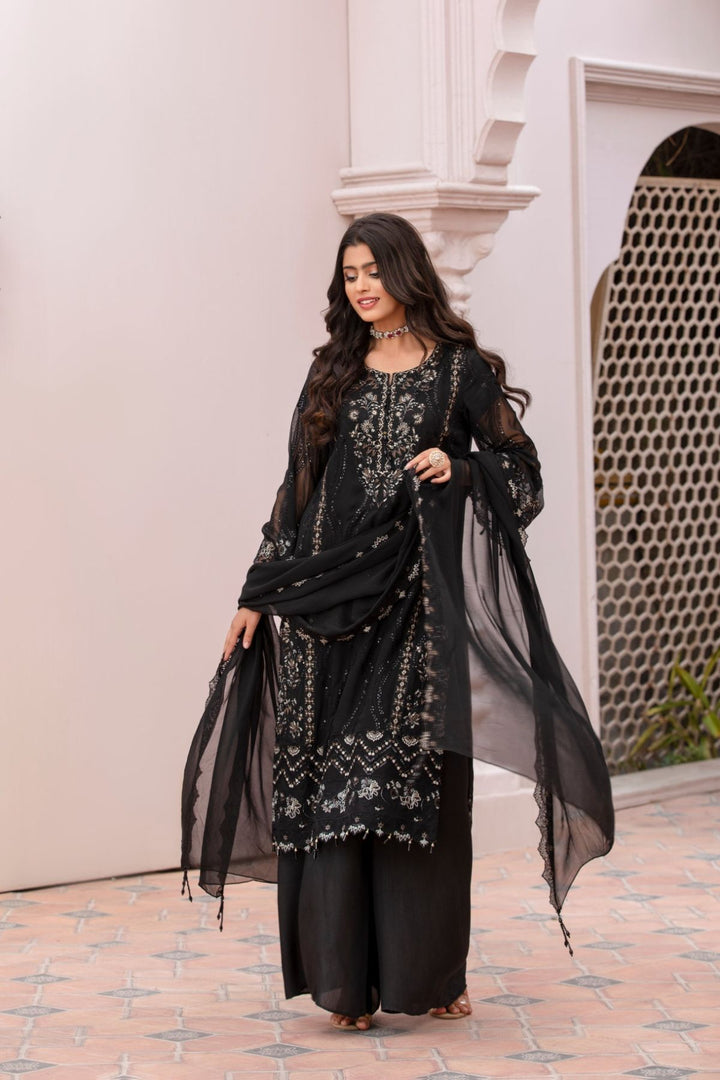 Transform your festive looks with our BLACK EMBROIDED CHIFFON ensemble. This set includes a stunning CHIFFON EMBROIDED SHIRT, luxurious CHIFFON DUPATTA, and a chic RAW SILK TROUSER. Take on any challenge with style and grace.