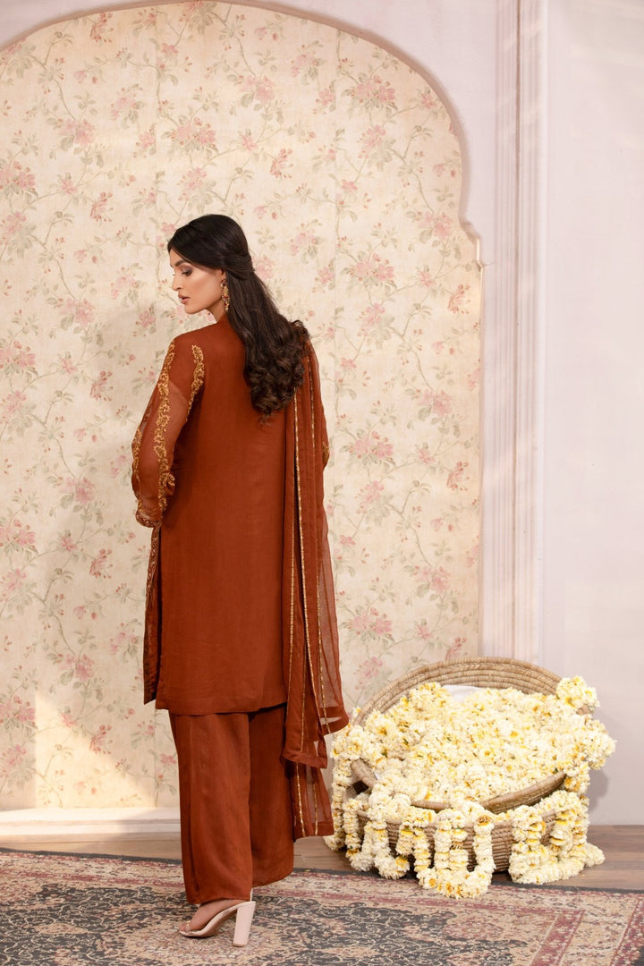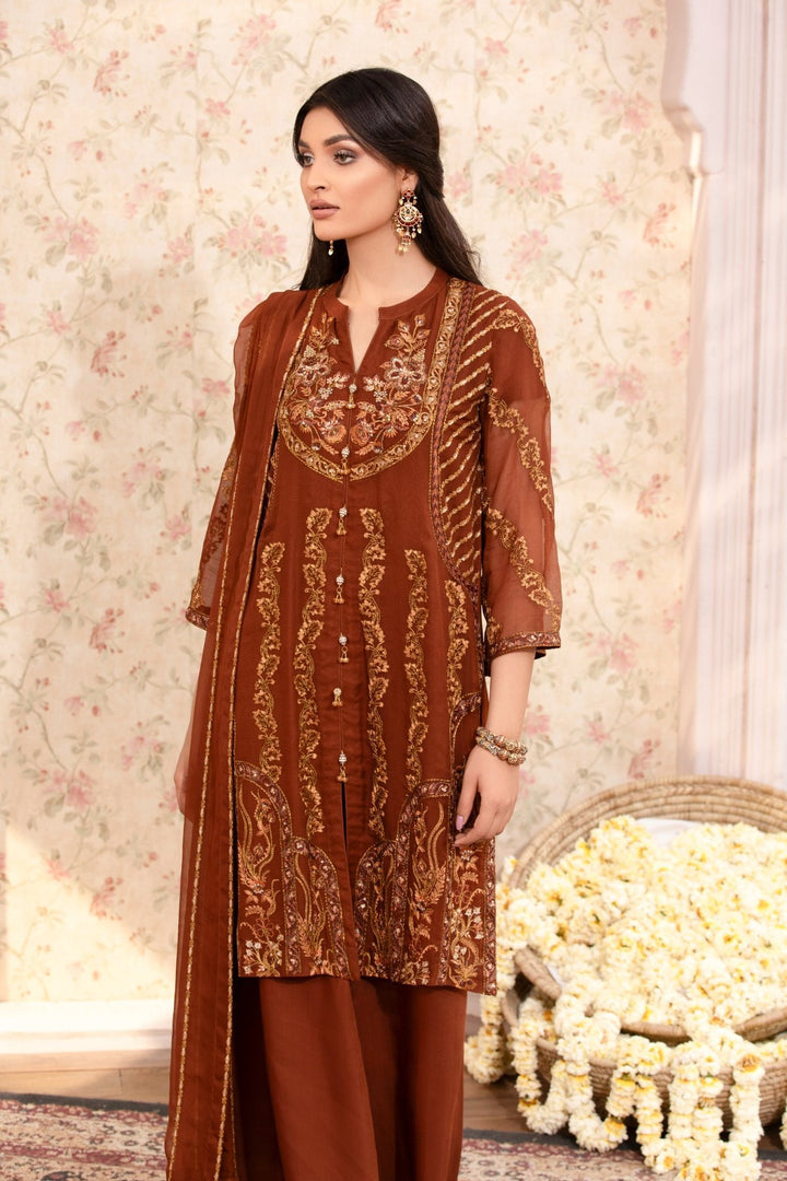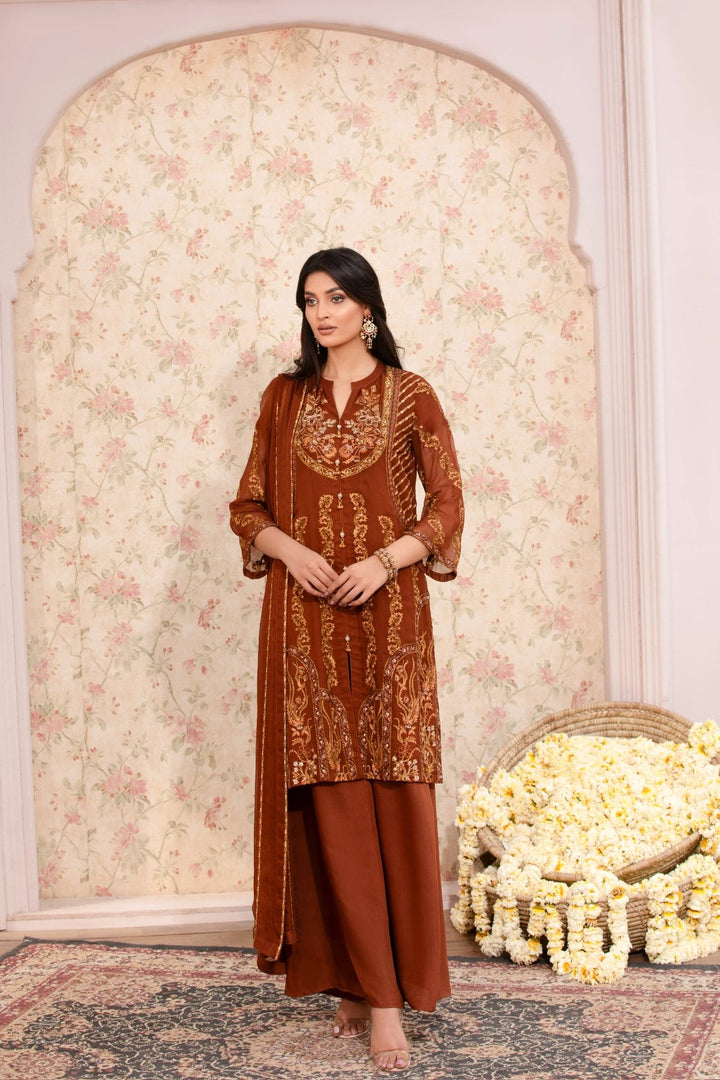 Turn heads in this luxurious BROWN EMBROIDED CHIFFON dress, featuring a shirt, dupatta, and trousers made of high-quality chiffon and raw silk. Perfect for any special occasion, this ensemble exudes elegance and sophistication.