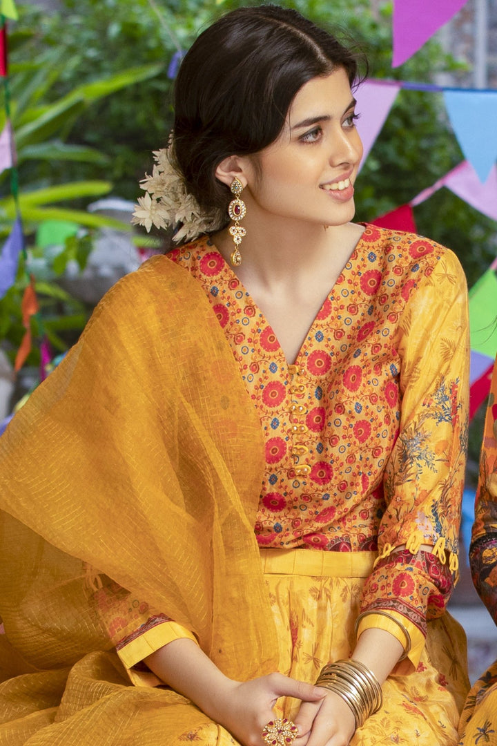 This women's dress features a raw silk shirt and trouser, paired with a zarri organza dupatta. The shirt has a flattering V-neckline with loops and crystal beads for added detail, and the sleeves are adorned with an intricate embellished design. The dupatta is also embellished with latkan beads for added elegance.