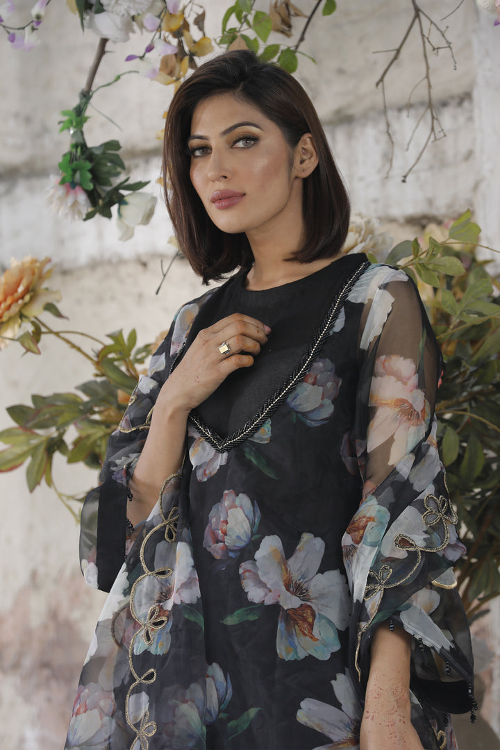 At the edge of the sleeves and daman, you'll find delicate beads and crystals that catch the light beautifully, adding an elegant touch to the design. The neckline is embellished with lace, creating a feminine and romantic look. The back of the dress features crystal buttons, adding a touch of glamour and sophistication.