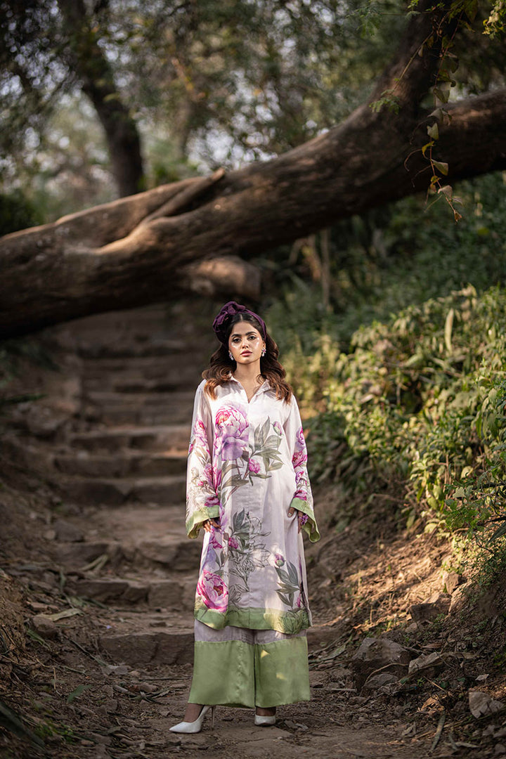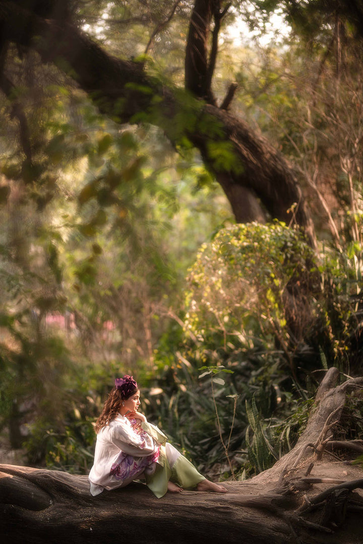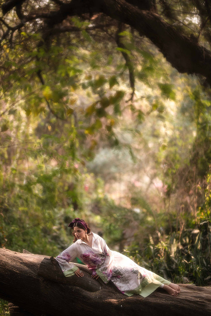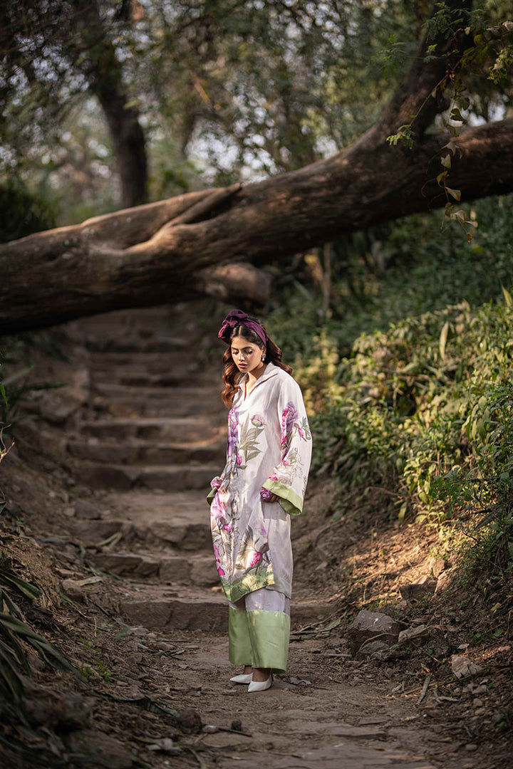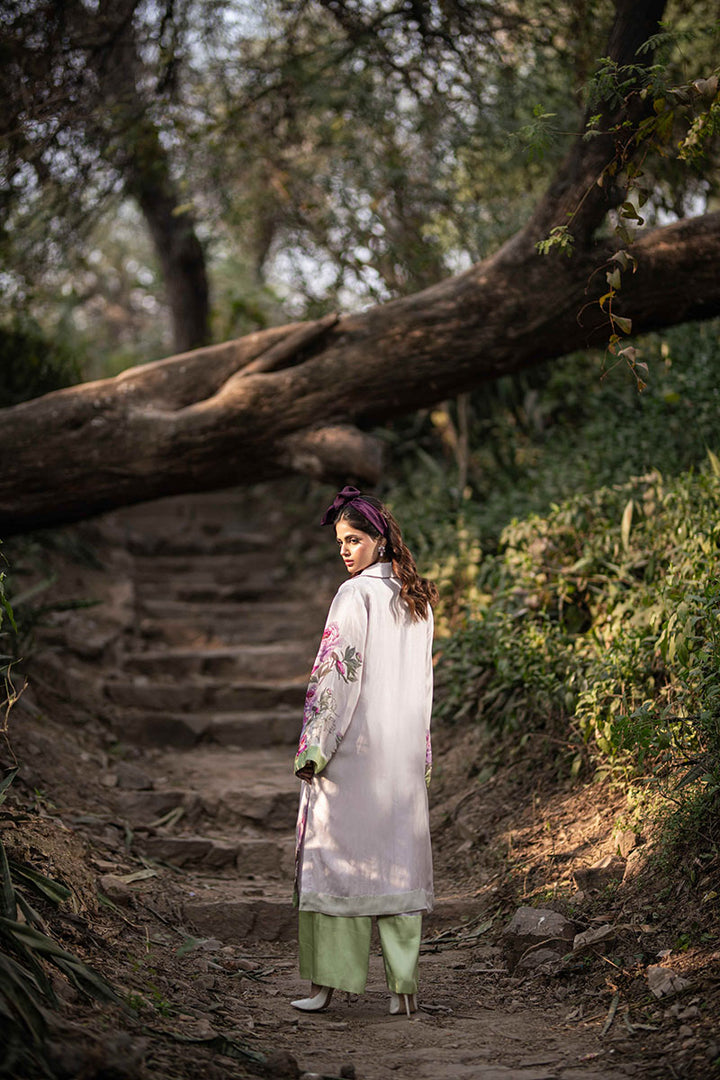 Indulge in the elegance of nature with this exquisite floral collection, crafted from the finest silk. Each design tells a story of grace and sophistication, blending timeless beauty with modern flair. The long frocks with center cuts exude regal charm, flowing effortlessly with every step. The pleated long frock adds a touch of movement and refinement, embodying poise and elegance. A playful yet chic short frock, paired with tailored bottoms, creates a statement of effortless style. Completing the collection, a structured blazer with flowing bell-bottoms strikes the perfect balance between power and femininity. Luxurious, graceful, and undeniably captivating—this collection is a celebration of art, fashion, and nature’s timeless allure.
