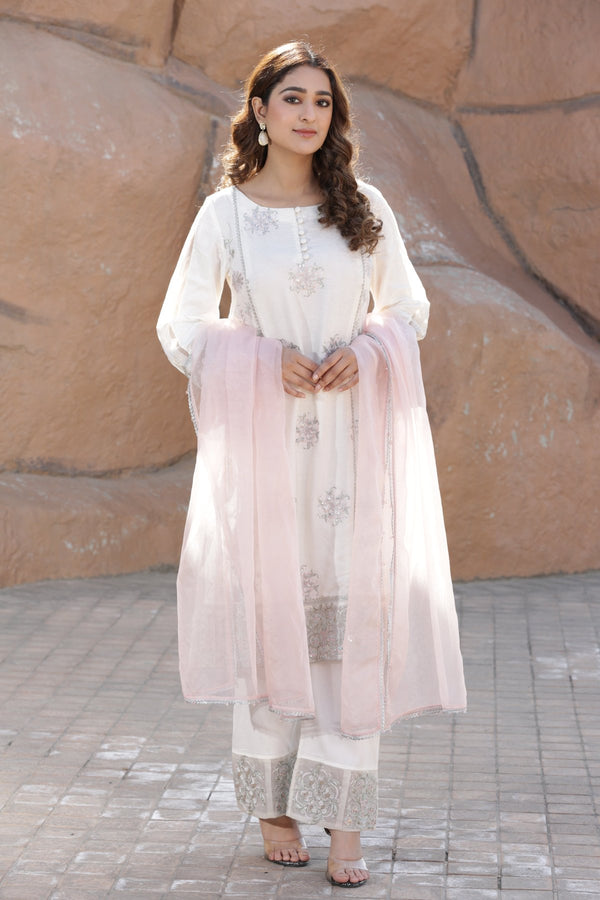 This gorgeous white chiffon suit is finished off with tila work on the sleeves and beautiful embroidery on the neckline, with straight pants adding to its allure. An ideal ensemble...