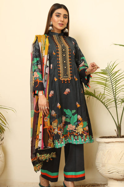 Digital black Color Print shirt with embroidered shirt Embroidery Chiffon dupatta Dyed Cotton Trouser- back