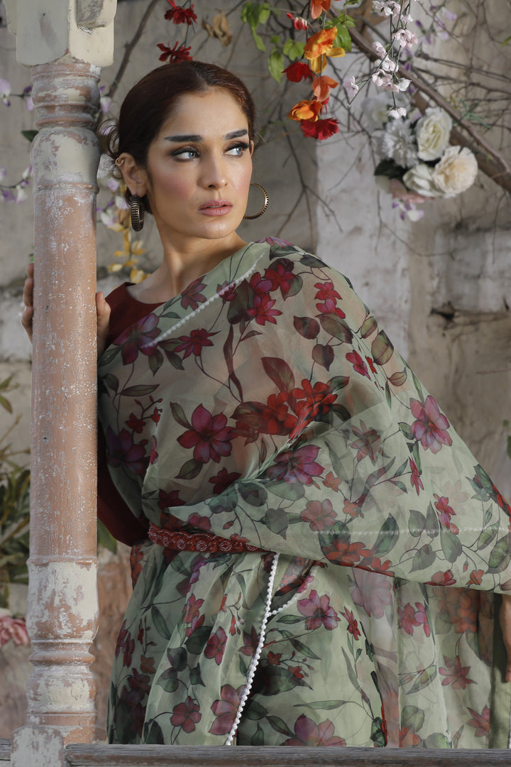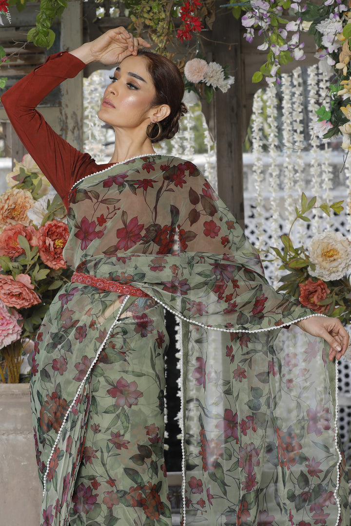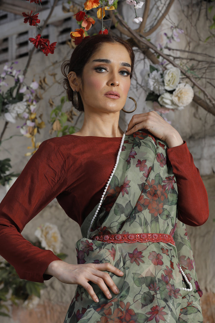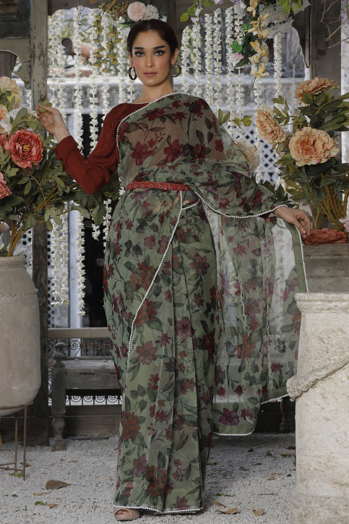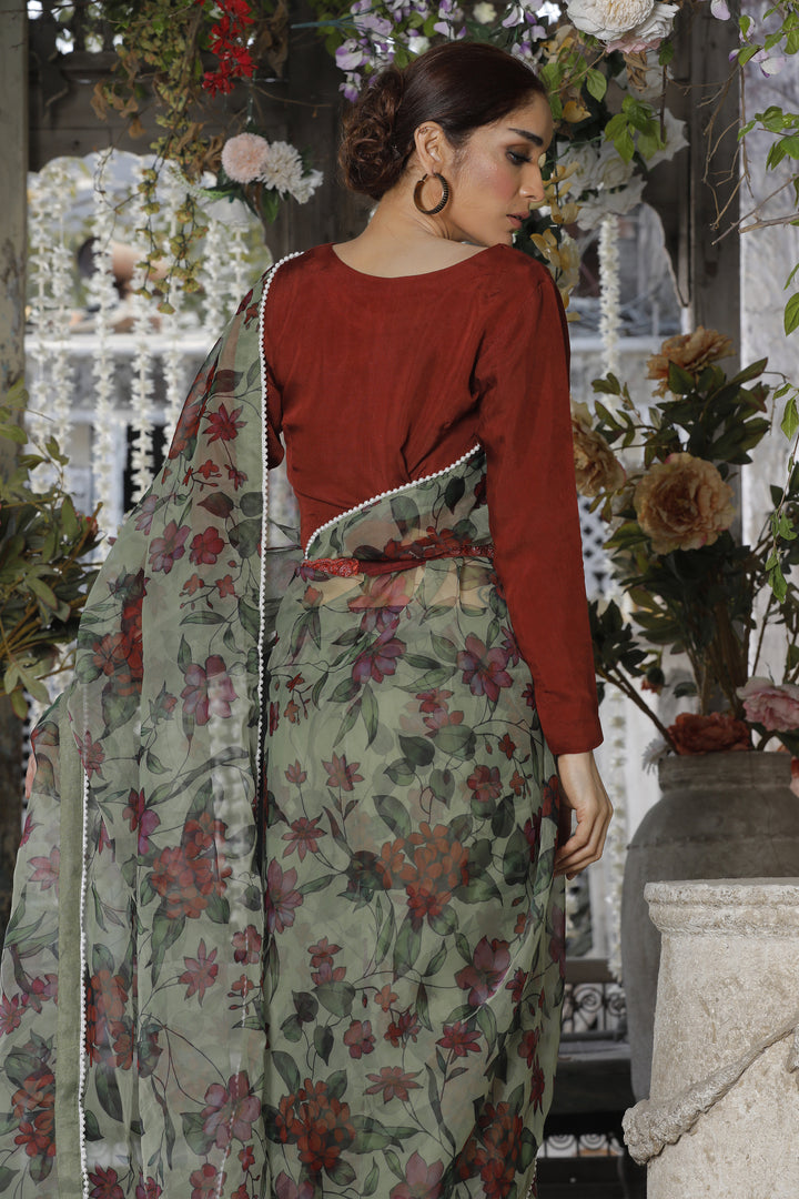 Introducing our stunning Red 3pc Women's Saree, featuring a gorgeous Green Organza sublimated printed shirt paired with a Viscous inner and trouser for ultimate comfort and style. The saree is adorned with a beautiful Pearl lace and an embellished handmade belt, adding a touch of elegance to your outfit. Whether you're attending a wedding or a formal event, this saree is sure to turn heads and make you feel like a true fashion icon.
