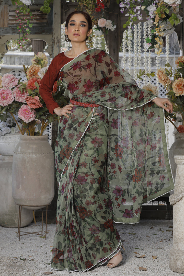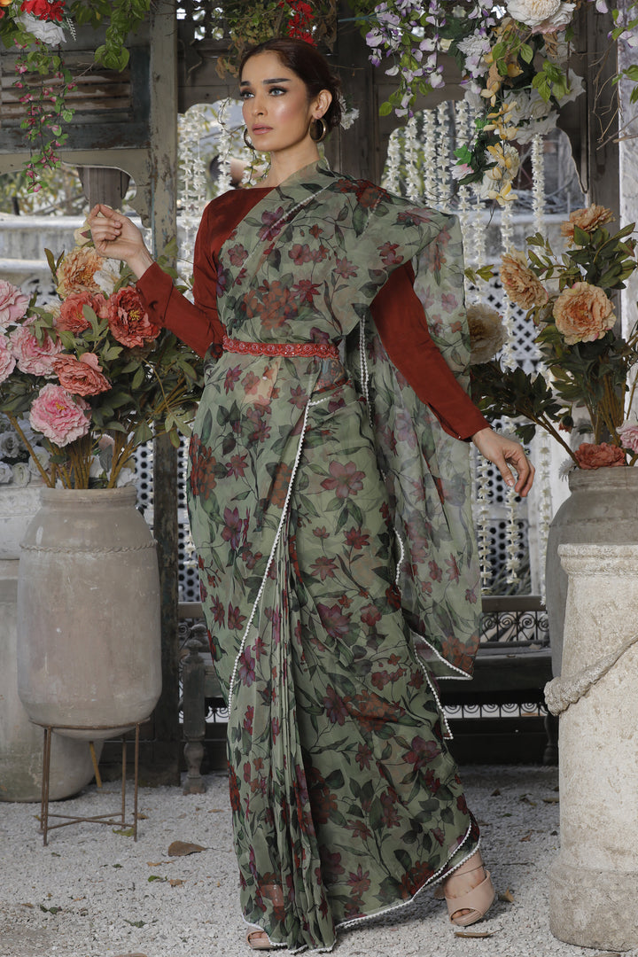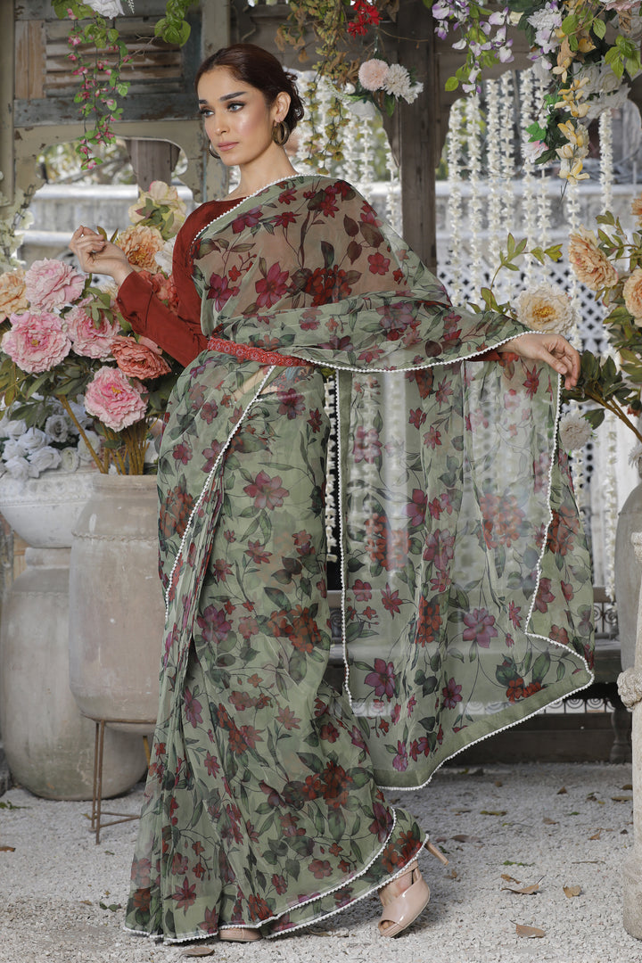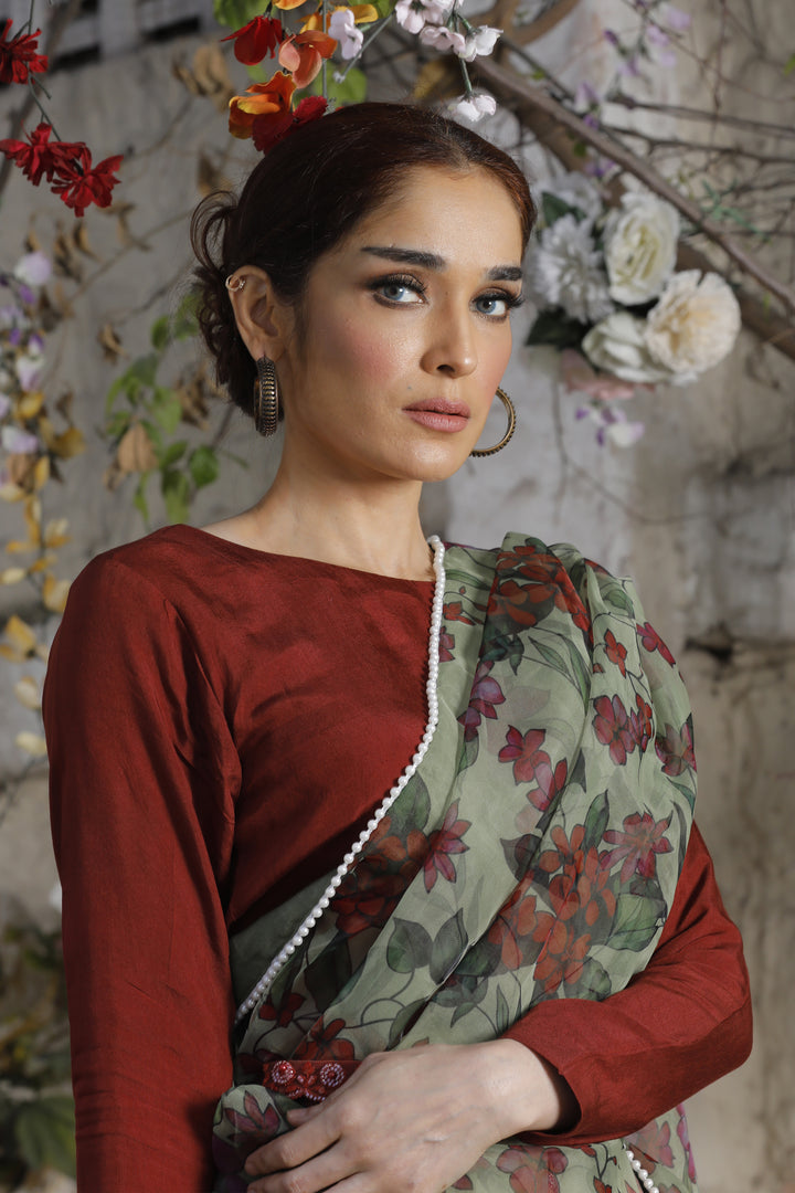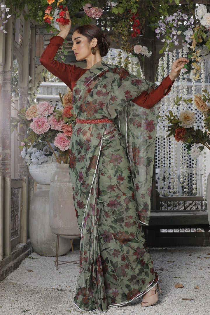 Introducing our stunning Red 3pc Women's Saree, featuring a gorgeous Green Organza sublimated printed shirt paired with a Viscous inner and trouser for ultimate comfort and style. The saree is adorned with a beautiful Pearl lace and an embellished handmade belt, adding a touch of elegance to your outfit. Whether you're attending a wedding or a formal event, this saree is sure to turn heads and make you feel like a true fashion icon.