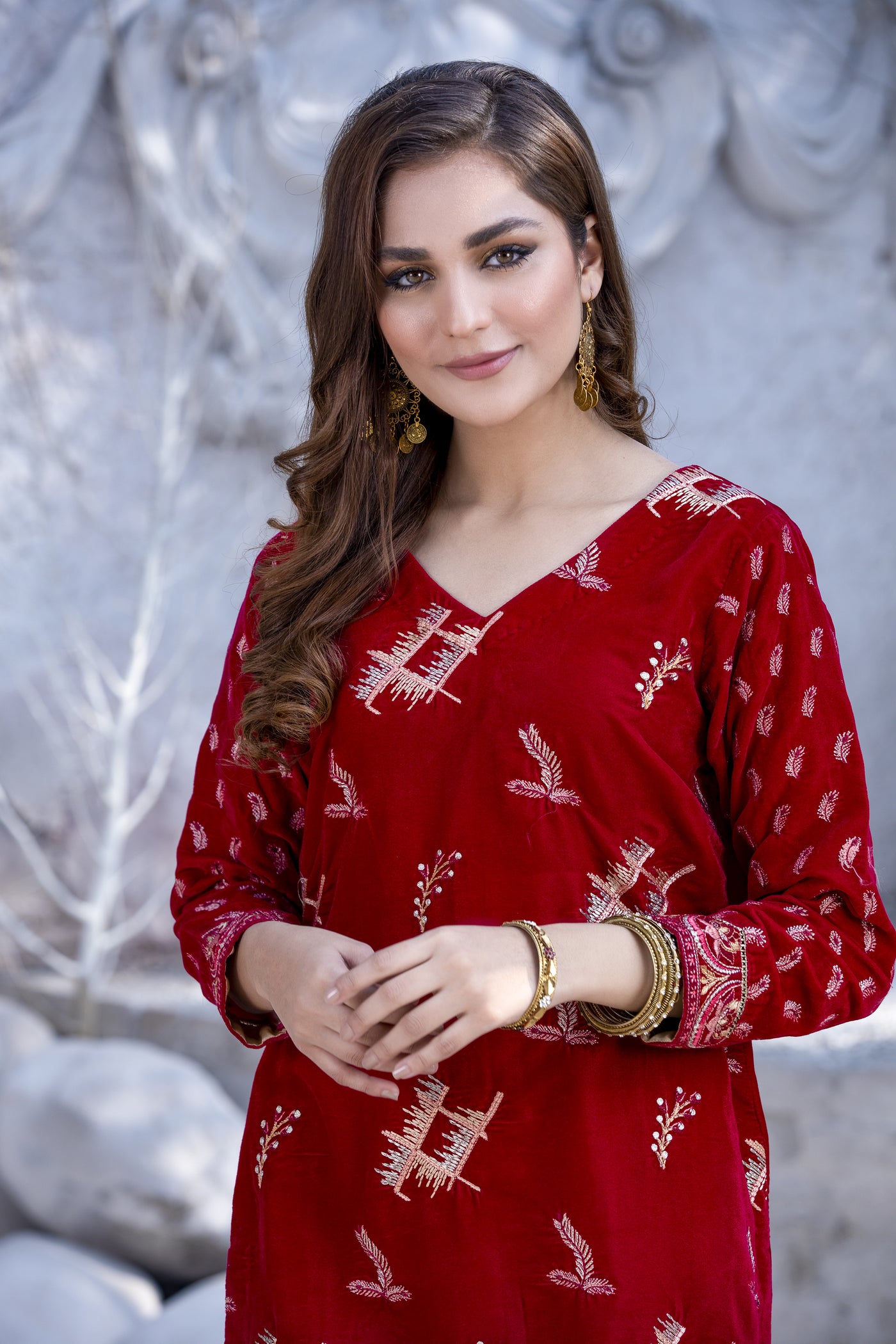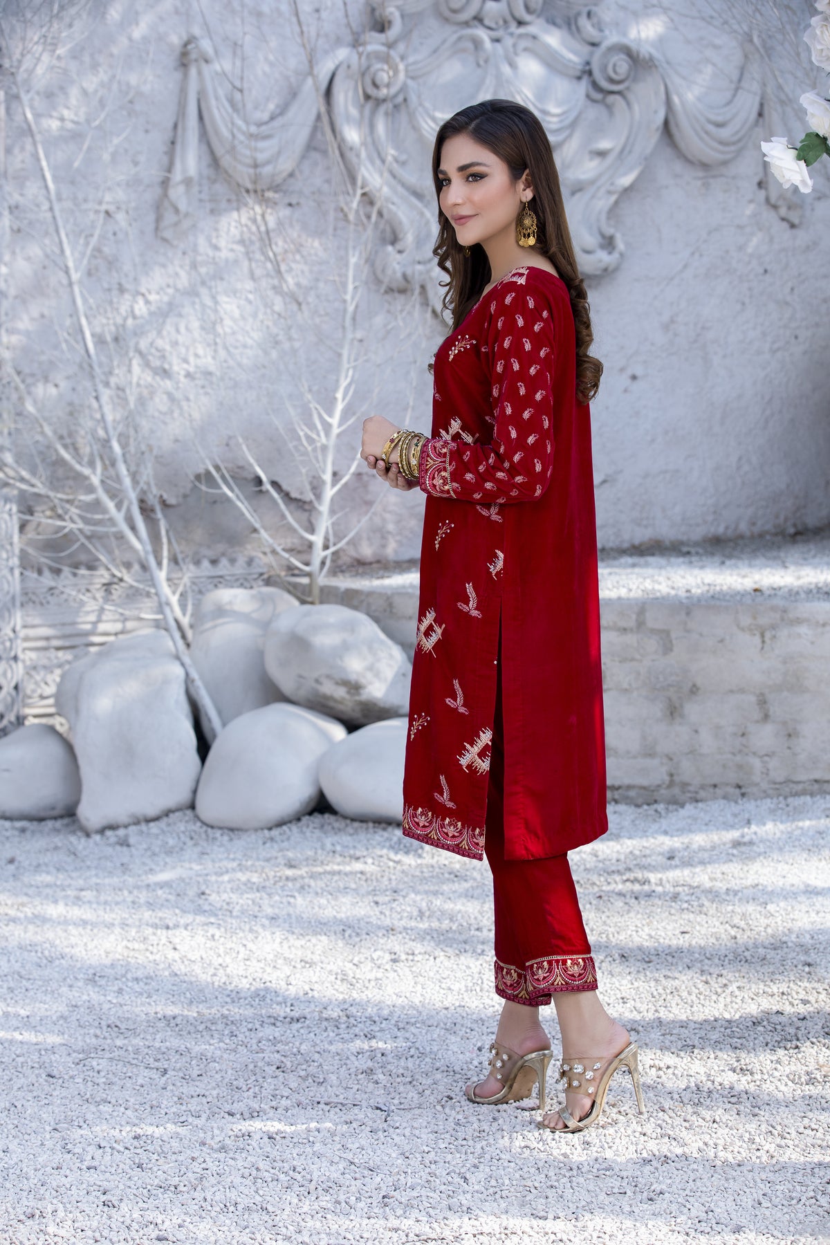 The dress is available in a variety of colors, including black, red, blue, purple and brown, making it easy to match with your favorite accessories. Step out in style with this beautiful embroidered velvet dress from Pakistan.
