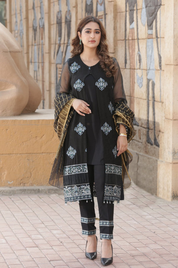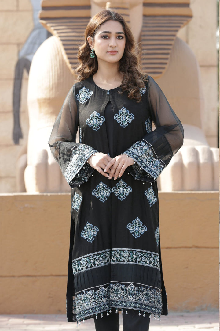 | LINEN-BLK-4PC-23 | Linen self-jacquard open-shirt with Turkish style embroidered motifs and border with minimal pearl detailing on border. | Linen trouser with embroidered hems. | A soft textured essential dupatta with a subtle gold check, perfect to pair with our black casual and semi-formal outfit | Pleated and mini pearl tussle details on organza full length sleeves. |
