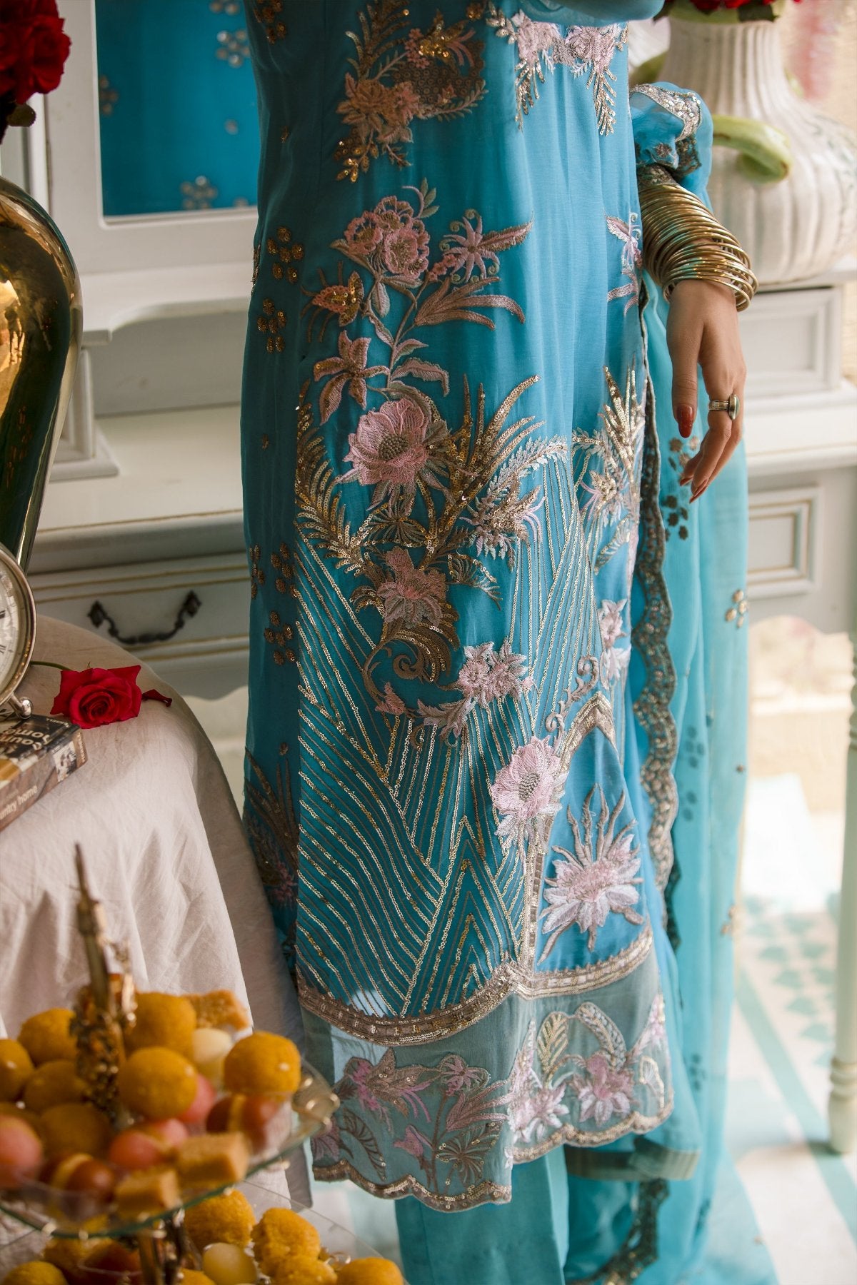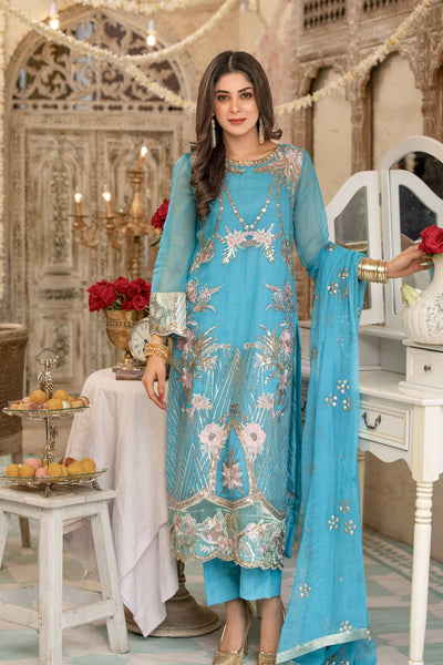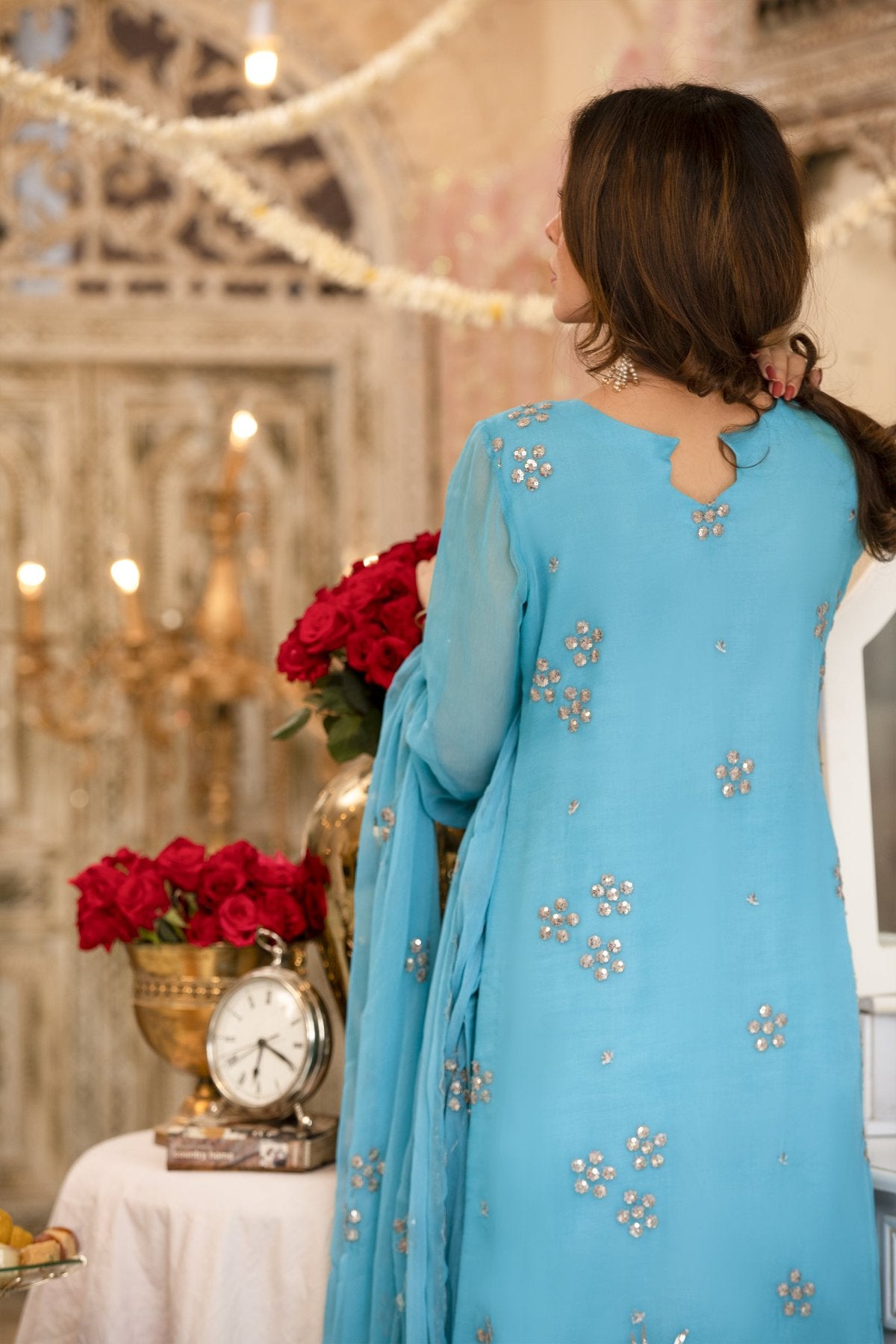 This women's dress features an embroidered shirt with intricate designs and details on the back, as well as an embroidered patch on the sleeves. It also includes a pair of straight trousers for a sleek and modern look. The dress is completed with an embroidered embellished dupatta that adds a touch of elegance and sophistication. Perfect for special occasions or formal events.