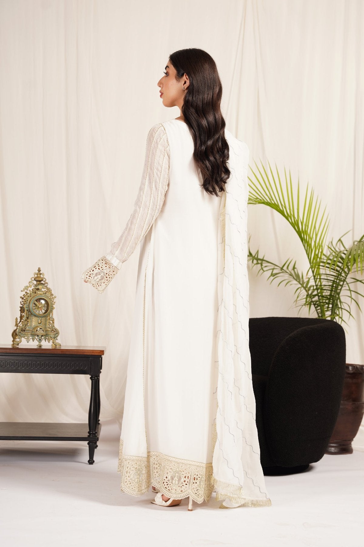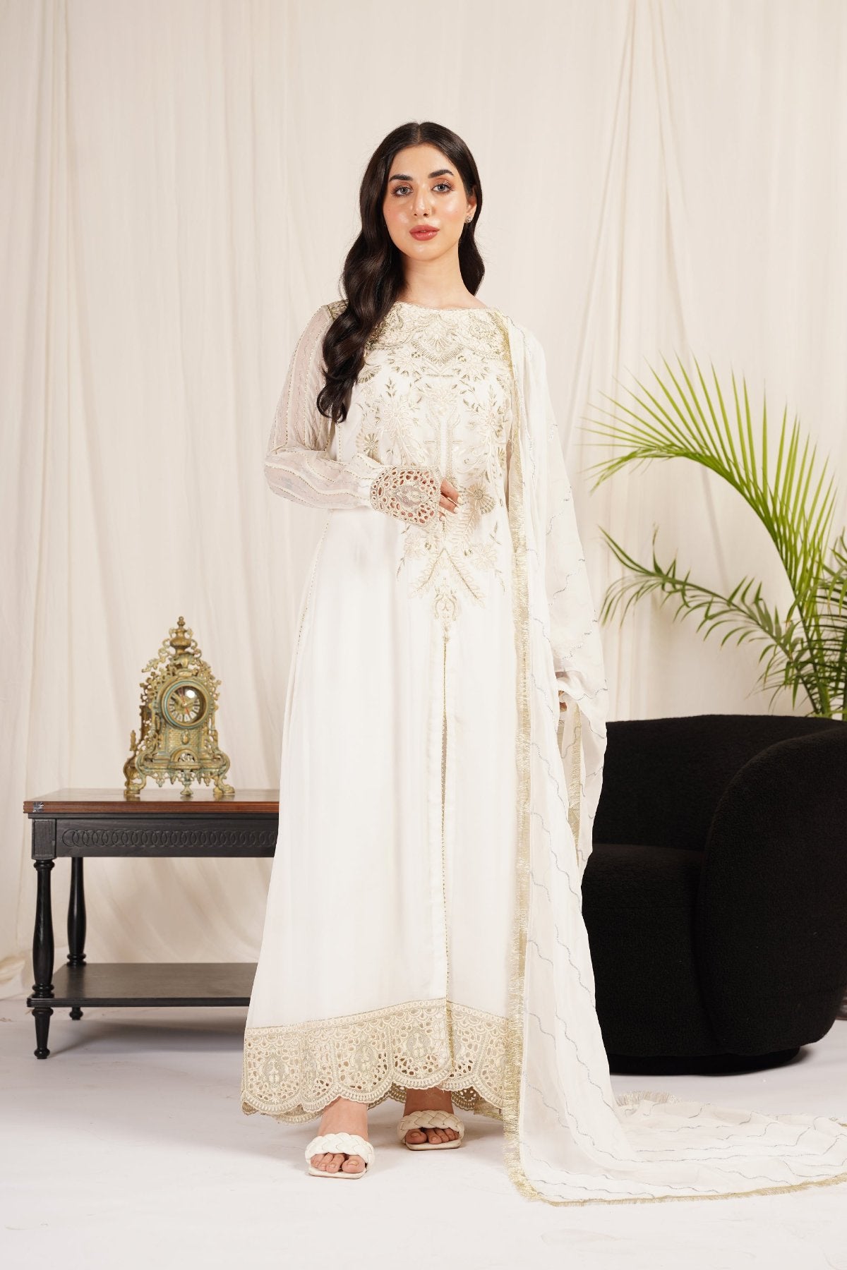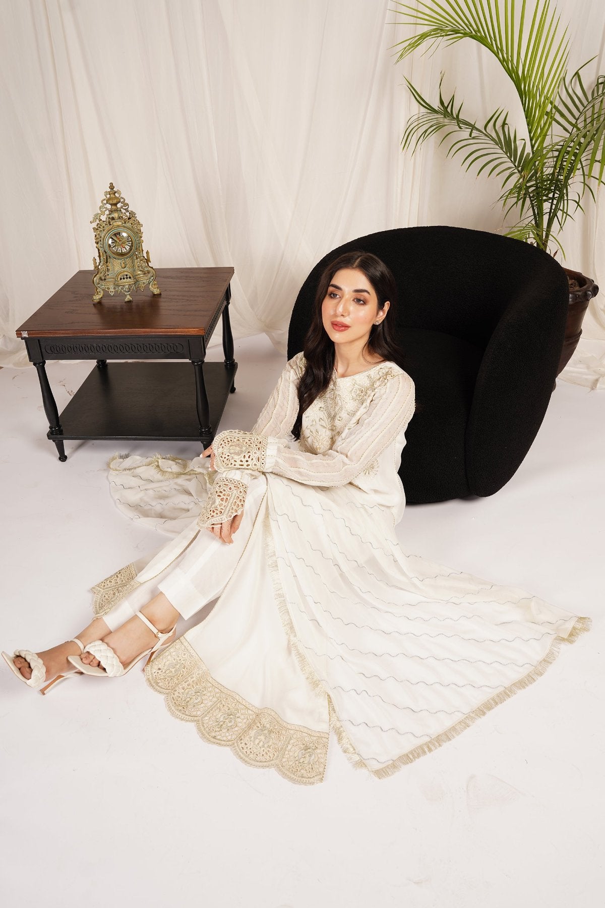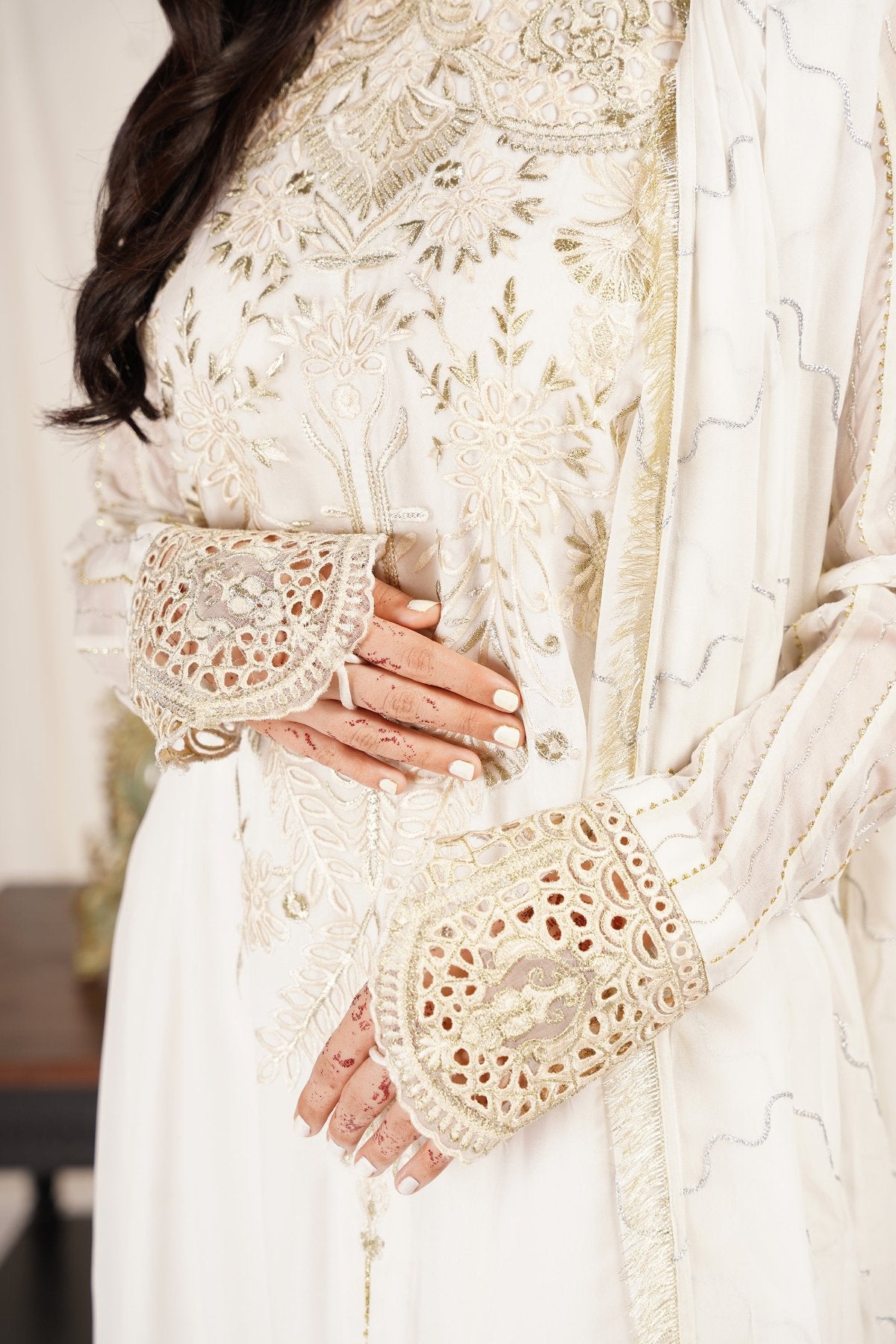 This gorgeous white chiffon suit is finished off with tila work on the sleeves and beautiful embroidery on the neckline, with straight pants adding to its allure. An ideal ensemble for any season. Immersed in the opulent fabric of customs, each element is crafted with affection and legacy.