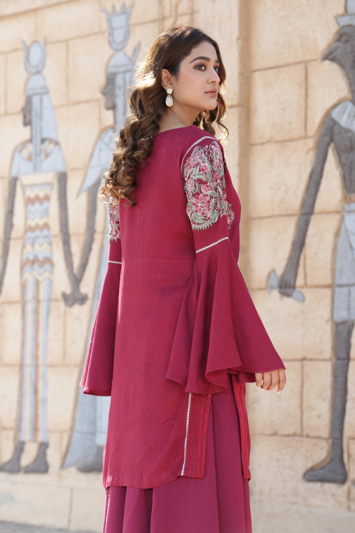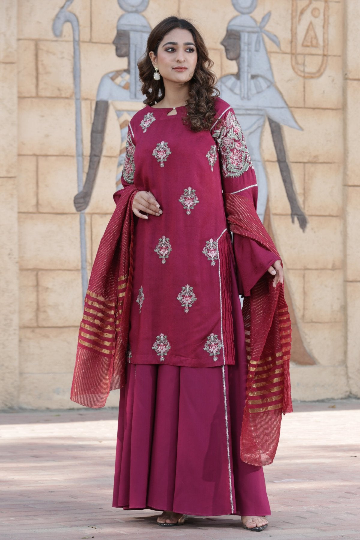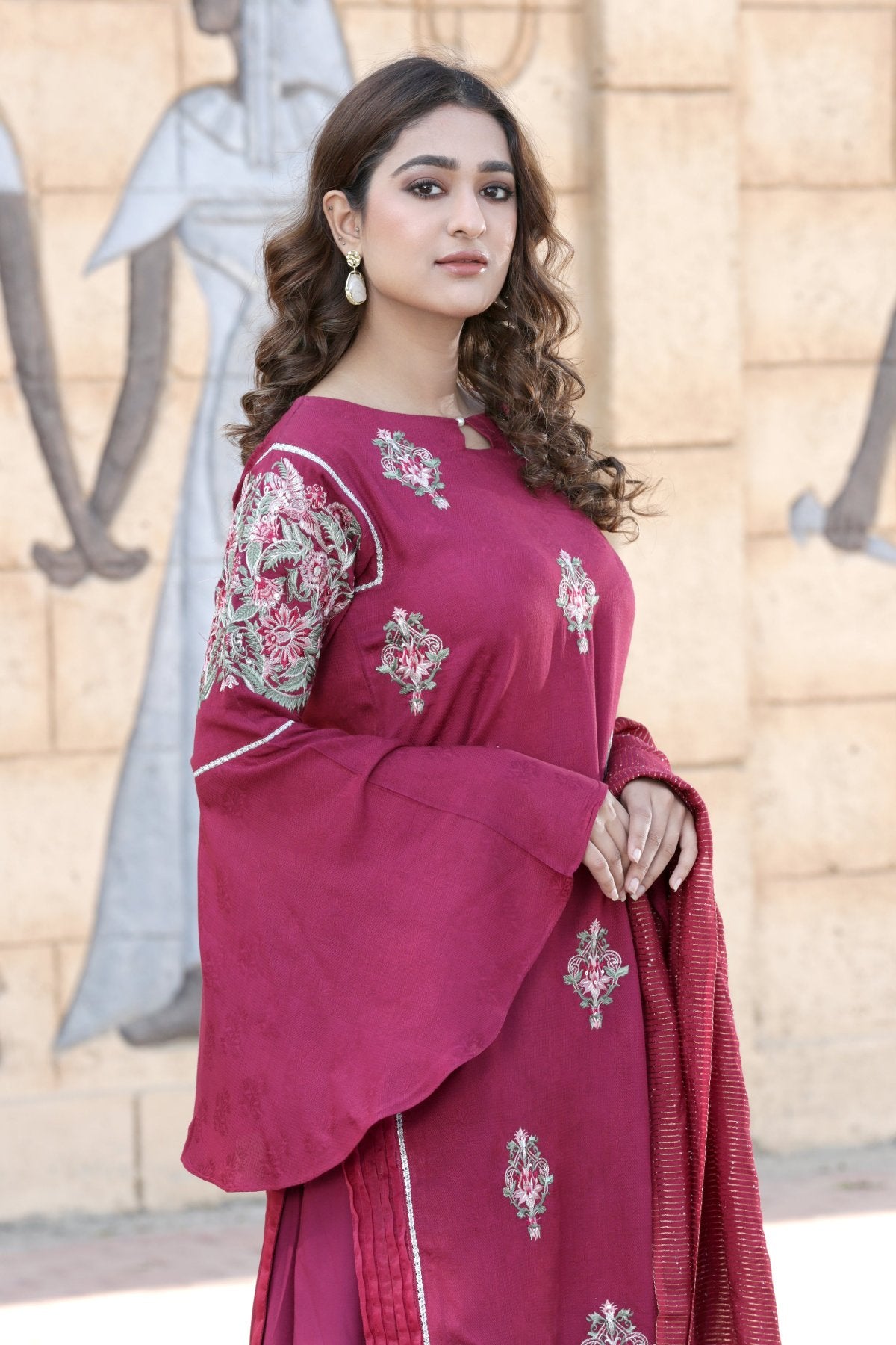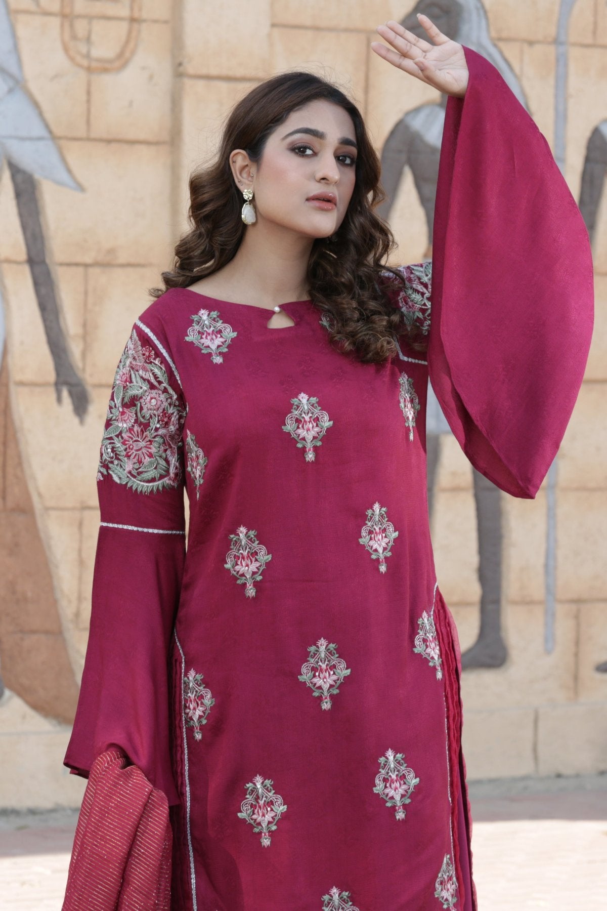 | LINEN-MGNTA-3PC-23 | A linen self-jacquard shirt with floral sequenced tilla embroidery with elegant merging of lace includes side pleats. | Linen trouser with open flare for our customers comfy and stylish look with beautiful merging of lace all around. | A soft textured essential dupatta with a subtle gold check, perfect to pair with our black casual and semi-formal outfit | Flare sleeves with a beautiful embroidered motif on its bicep |