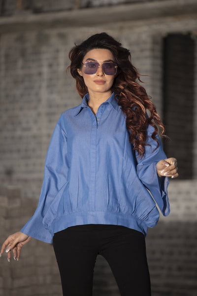 This denim top shirt is the perfect addition to any woman's wardrobe. Made with high-quality denim fabric, it is both durable and comfortable to wear. The classic design features making it versatile for both casual and formal occasions. The relaxed fit allows for easy movement, making it perfect for everyday wear. Pair it with jeans or dress it up with a pant for a stylish, on-trend look.